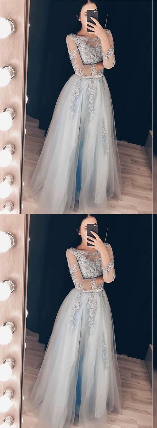 Gray tulle lace long prom dress, long sleeve evening dress cg6157