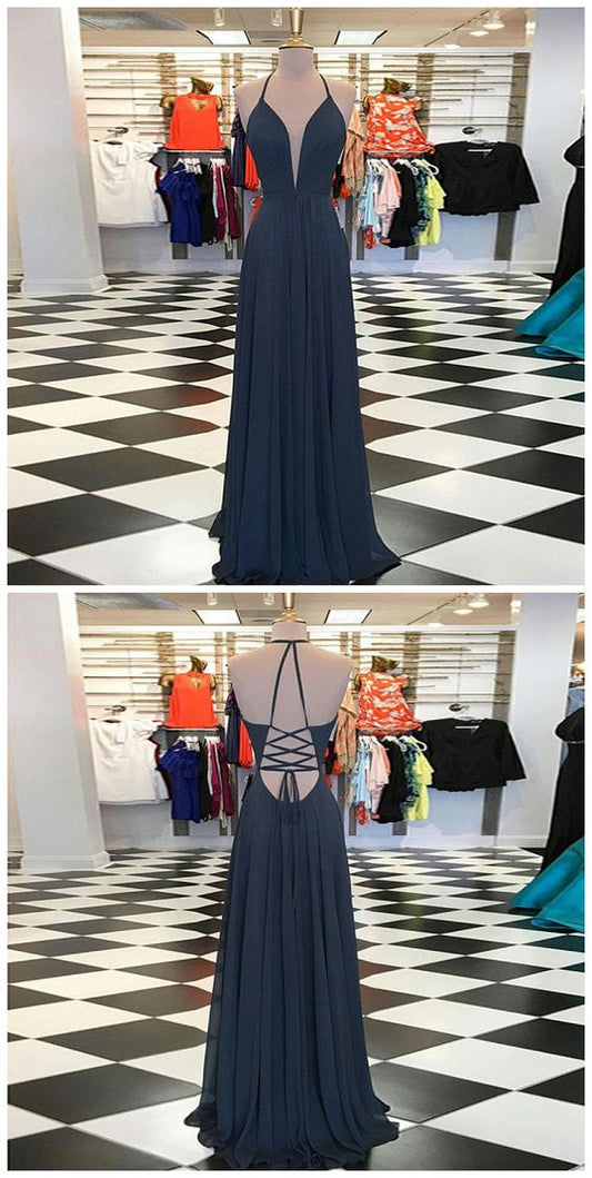 A-Line V-Neck Sweep Train Navy Blue Chiffon Prom Dress cg7128