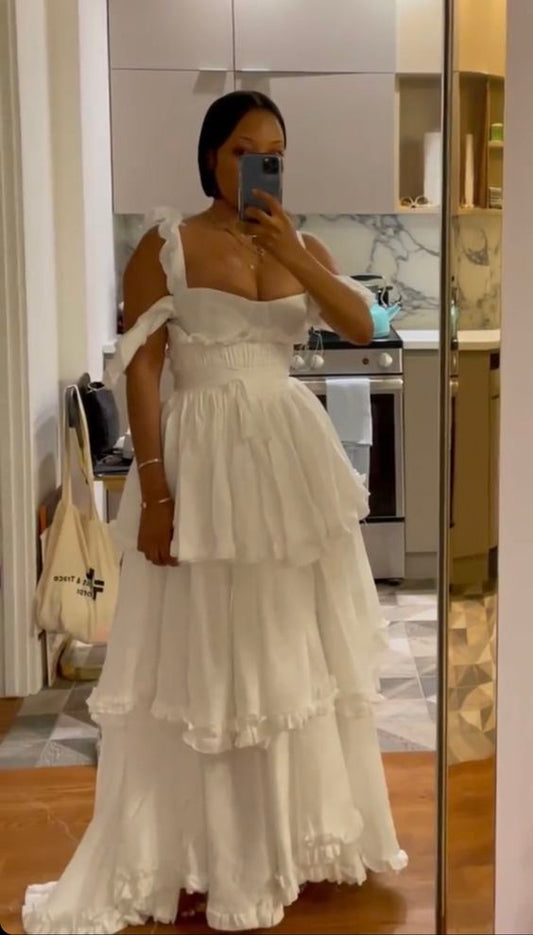 Sexy A line Straps Ruffles Floor Length Chiffon White Prom Dress 1697