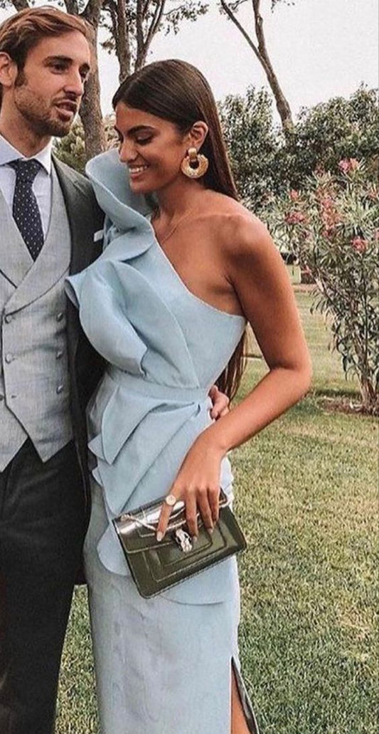 Sexy Sheath One Shoulder Light Sky Blue Long Prom Dresses P1811