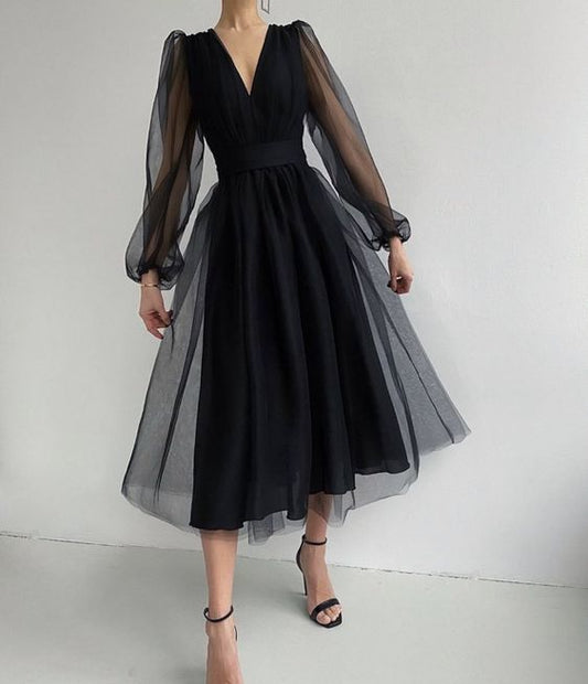 Unique Black Tulle Long Sleeves Prom Dress cg10005