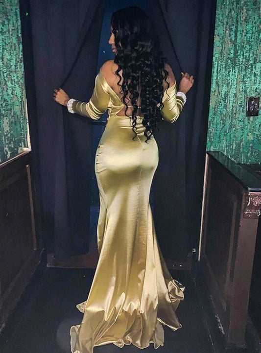 Yellow Mermaid Satin See Through V-neck Long Sleeve Backless Prom Dress cg12857