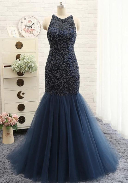 Navy Prom Dress,Mermaid Prom Gown,O-Neck Evening Dress,Beading Prom Gown cg14084