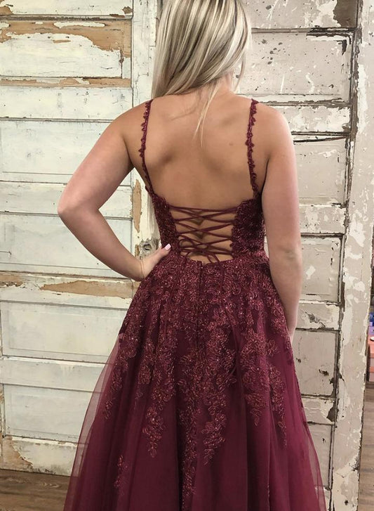 Burgundy v neck tulle lace long prom dress evening dress cg14971