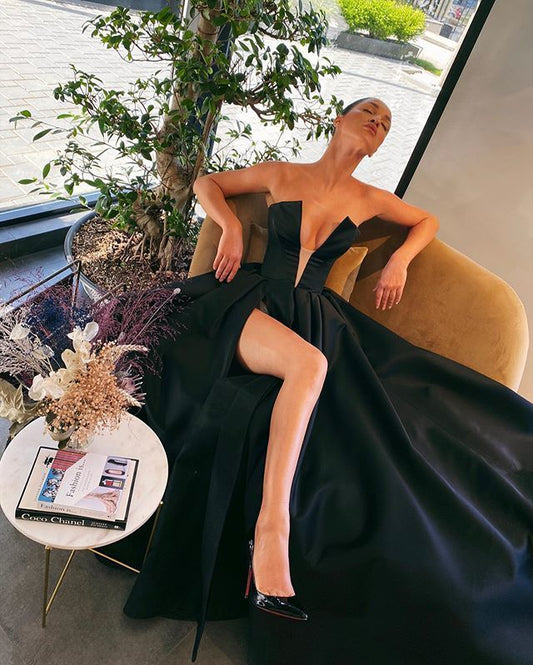 Hot Sexy A Line Deep V Neck Black Long Prom/Evening Party Dress with Split Front cg15486