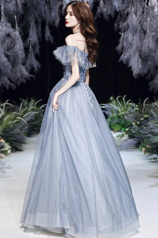 GRAY TULLE LACE LONG A LINE PROM DRESS EVENING DRESS cg20384