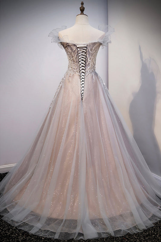 Unique champagne tulle lace applique long prom dress, champagne evening dress cg21628