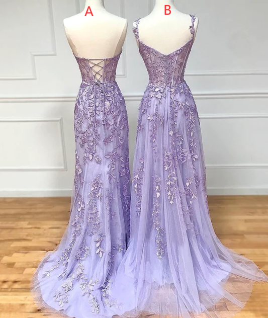 Spaghetti Strap Prom Dresses Long Tulle Lace Appliques Princess Birthday Party Dress Purple cg24943