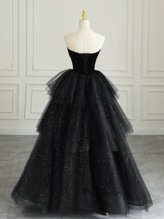 Black Strapless Tulle Formal Dress with Velvet, A-Line Sweetheart Neck Long Prom Dress cg25038