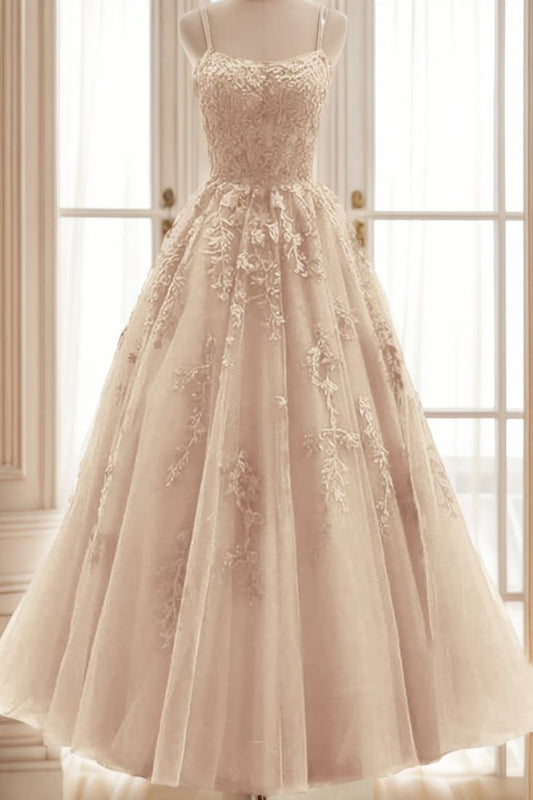 A-line V Neck Spaghetti Straps Long Lace Tulle Prom Dress cg25267