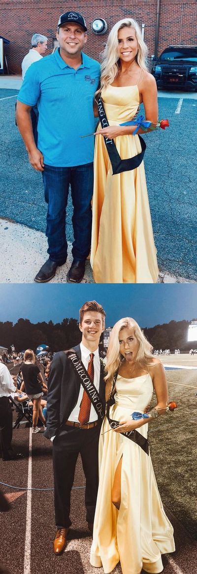Sexy V Neck Yellow Satin A Line Long Prom Dresses, Backless Formal Dresses cg404