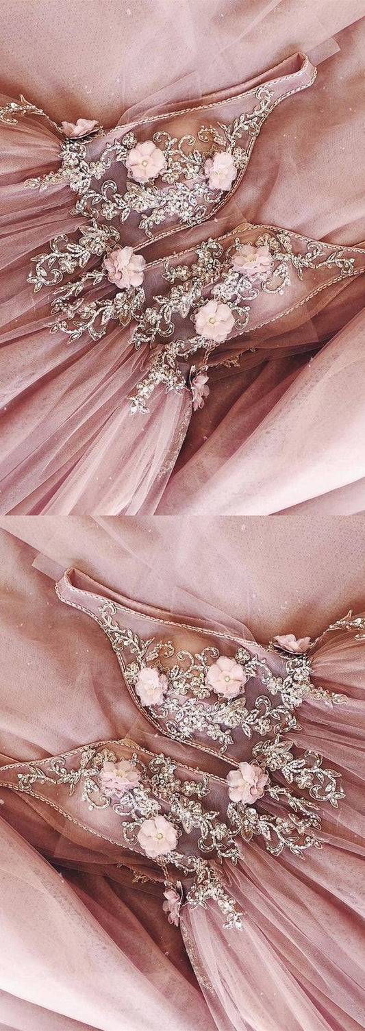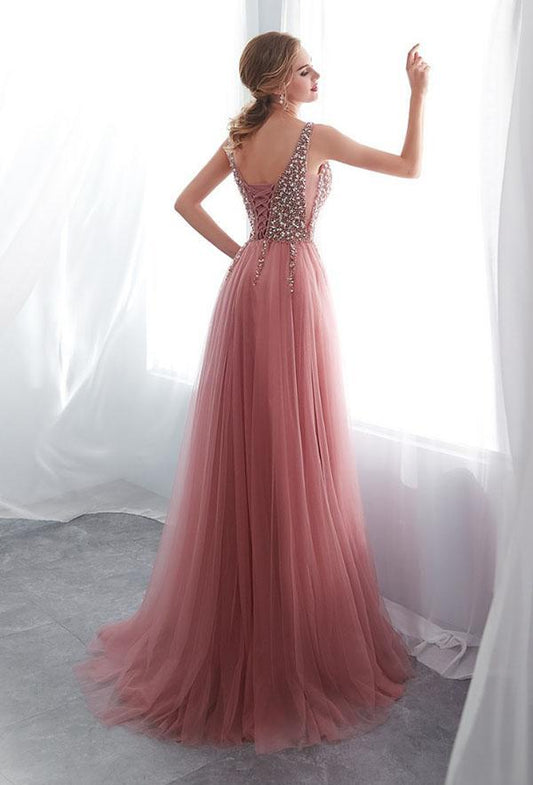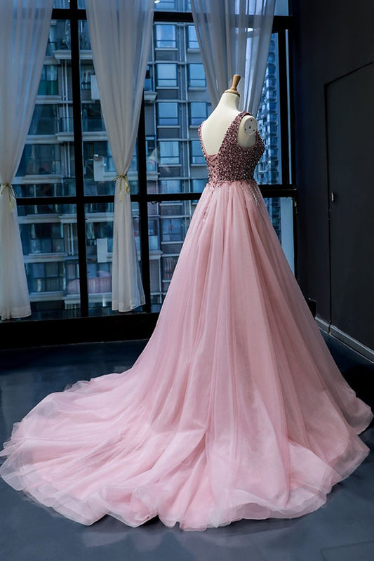 Pink Tulle Beaded Sequins Train V Neck Prom Dress, Pearl Evening Gown cg415