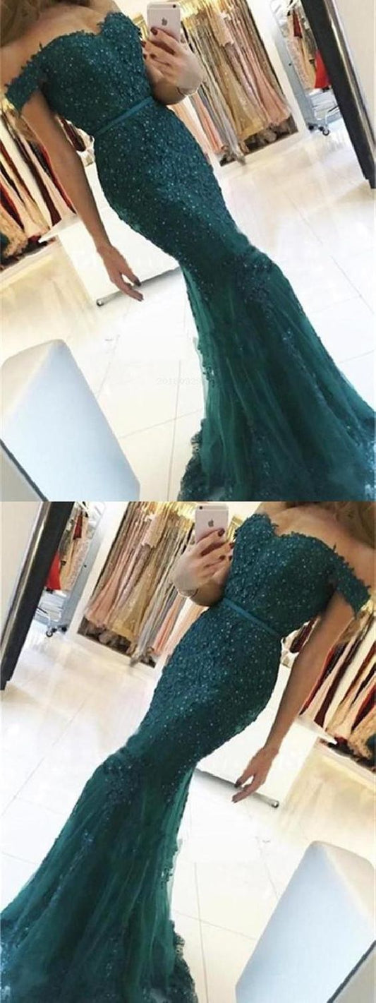 2019 Sweetheart Neck Evening Prom Dresses, Hunter Green Off Shoulder Lace Prom Dresses cg449