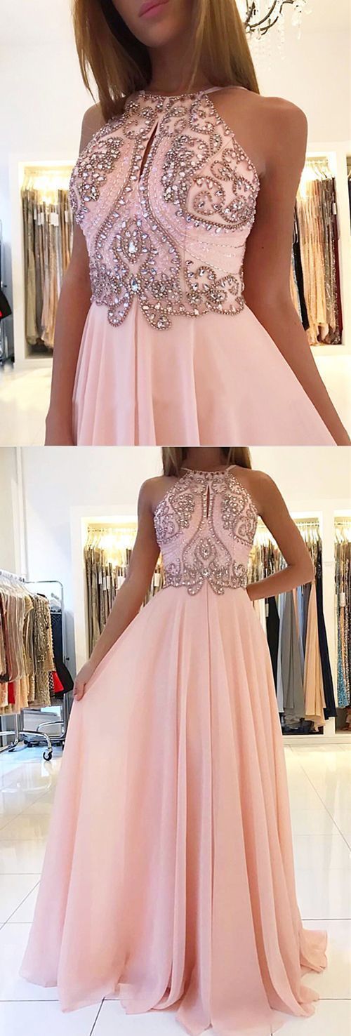 Blush Pink Halter Chiffon Open Back Long Prom Dress,Formal Gown With Beaded Top cg454
