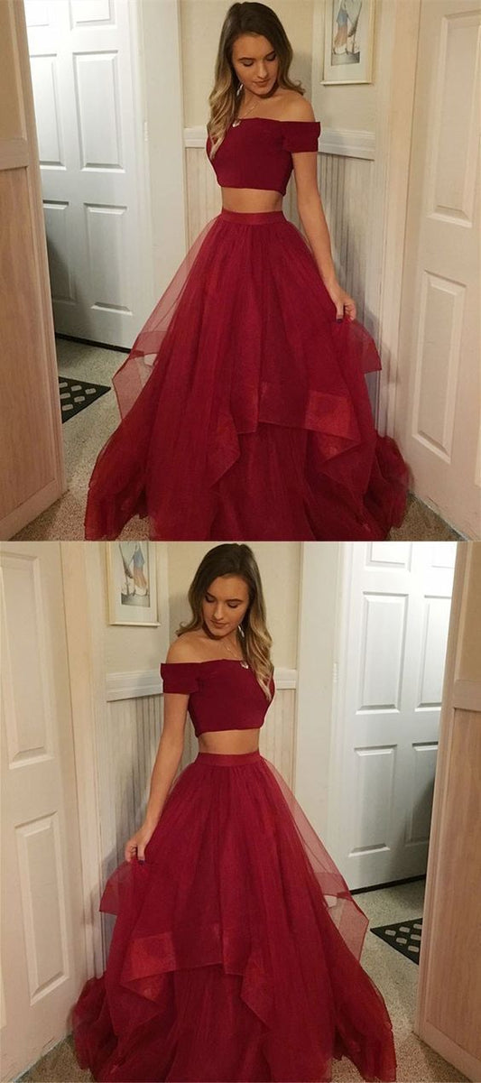 Two Piece Off-the-Shoulder Dark Red Satin Prom Dress with Lace Beading ,burgundy prom dress cg459