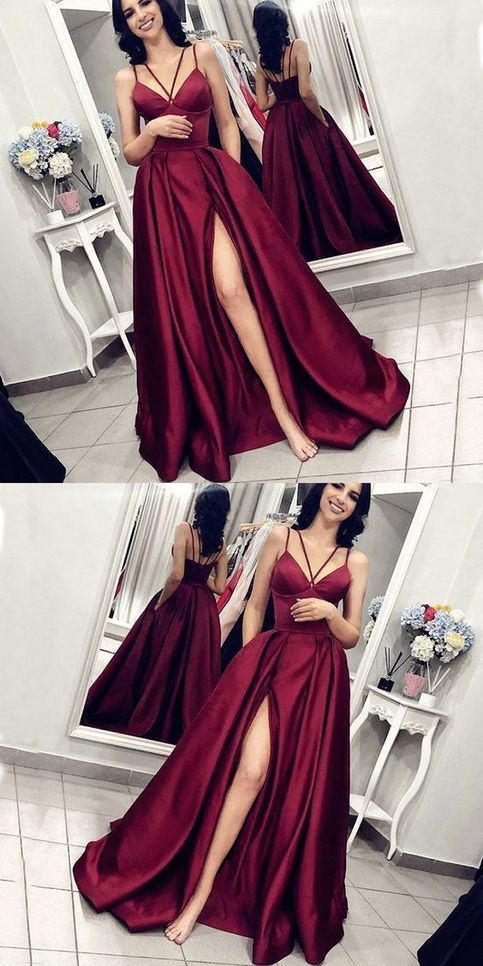Chic Burgundy Spaghetti Strap Side Slit Backless Long Evening Prom Dresses cg458