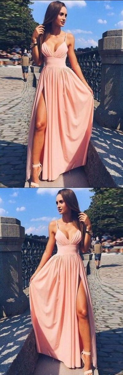 Straps V Neck Beads Long Prom Dress with Side Slit cg400