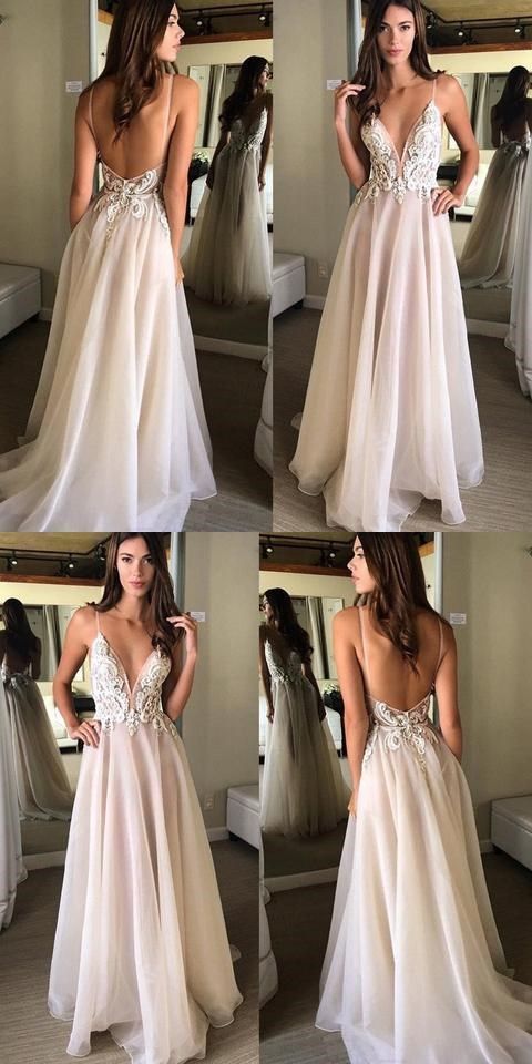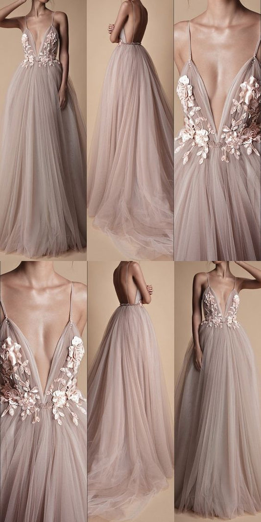 Deep V-neck Spaghetti Straps Lace Appliqued Beach Wedding Dress,Sexy Prom Dresses cg399