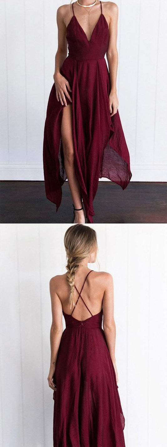 Sparkly Prom Dresses Burgundy V-neck Long Prom Dress with Slit Sexy Evening Dress cg493