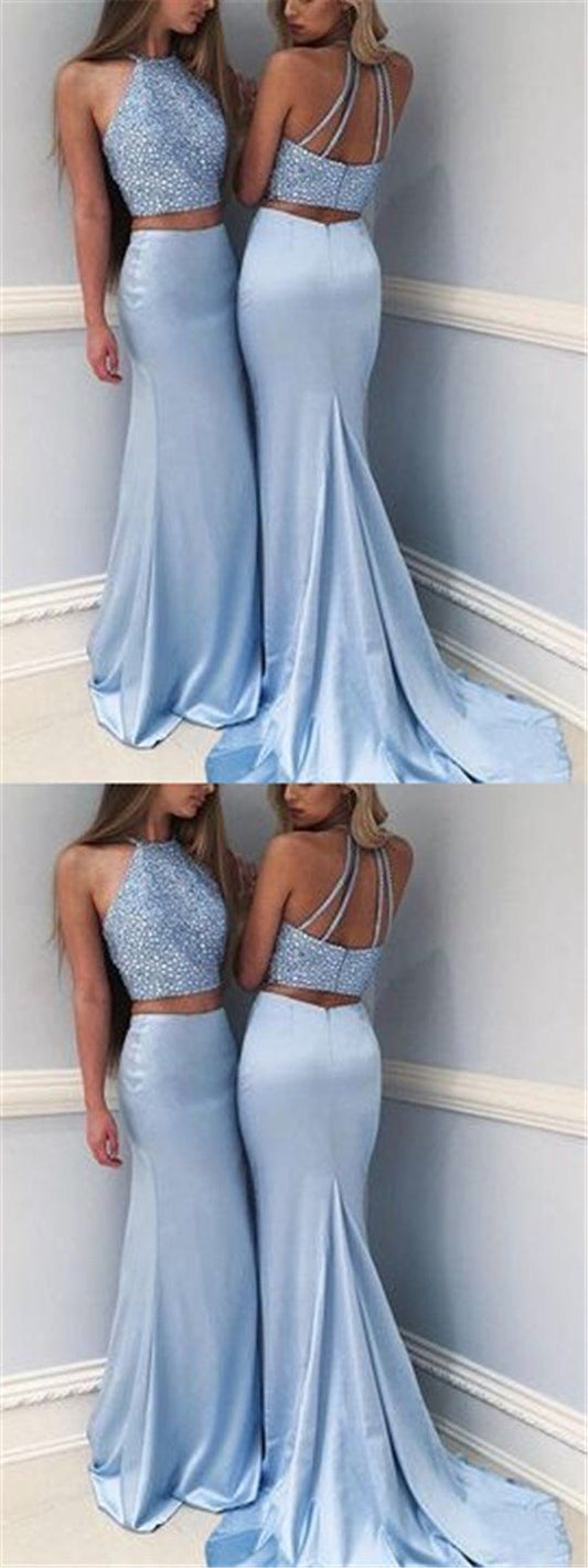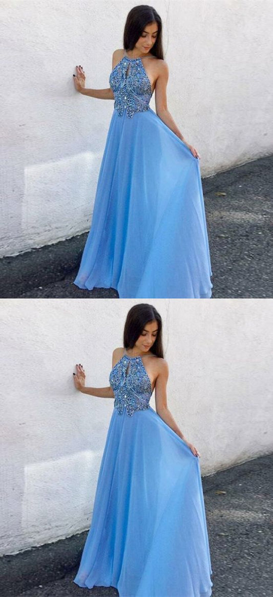 Light Blue Halter Beaded Long Soft Satin Prom Dresses cg632