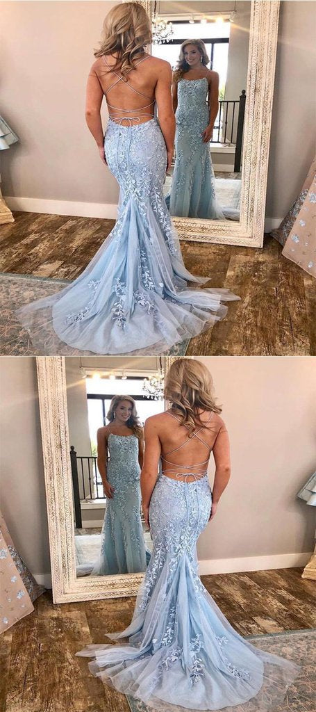 Sexy Mermaid Lace Blue Backless Long Prom Dresses cg611