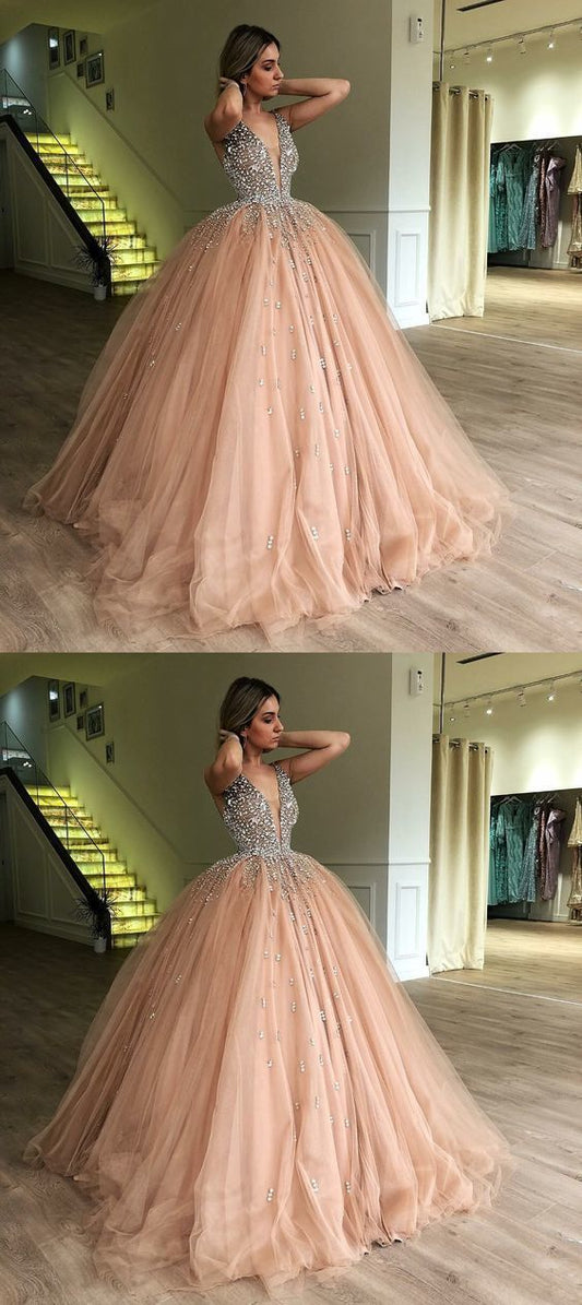 Ball Gown Deep V-Neck Low Cut Champagne Quinceanera Dress with Beading , sparkly prom dress cg635