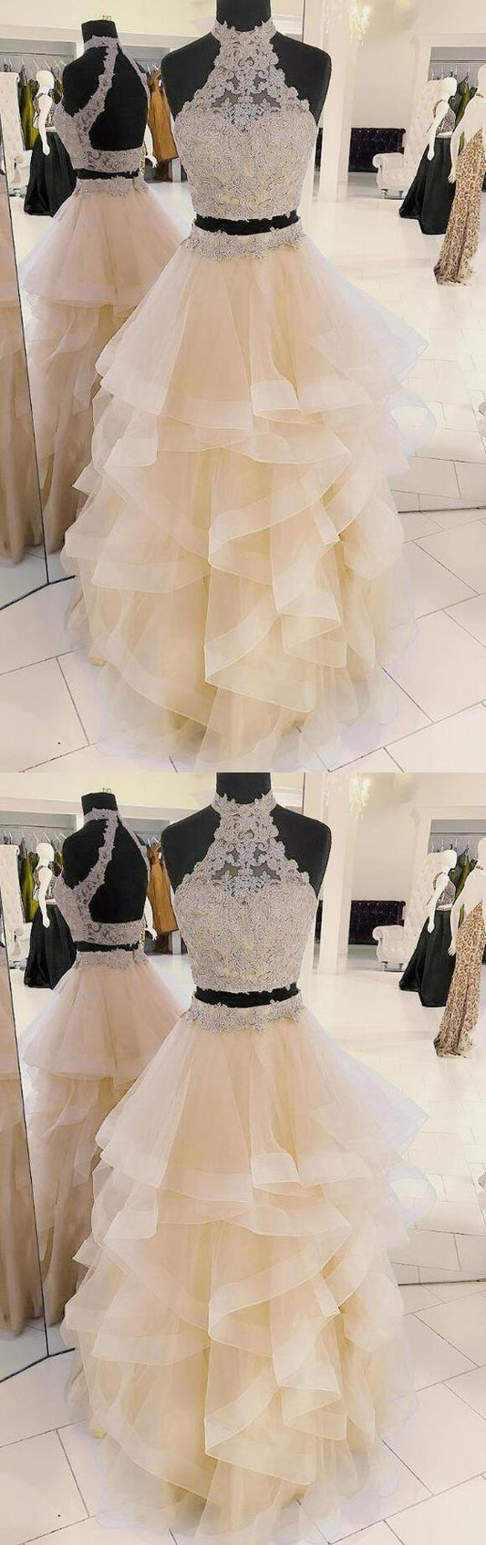 Halter Champagne Prom Dress,New Arrival Two-Piece Prom Dress,Cheap prom Dress,Beading Prom Dress,Tulle Long Prom/Evening Dress with Applique cg984