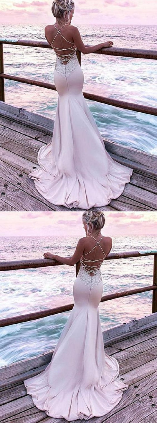 Mermaid Spaghetti Straps Sweep Train Blush Prom Dress with Appliques cg1339