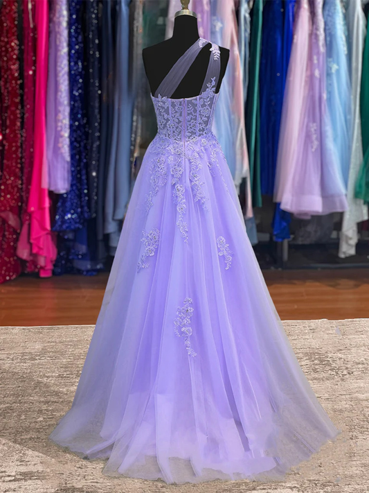 Purple Tulle One Shoulder Appliques Prom Dress fg5402