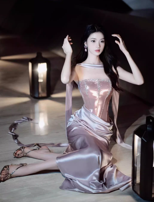 Purple Exquisite Beaded Sheath Strapless Corset Satin Prom Dress Party Dress with Slit SH3759