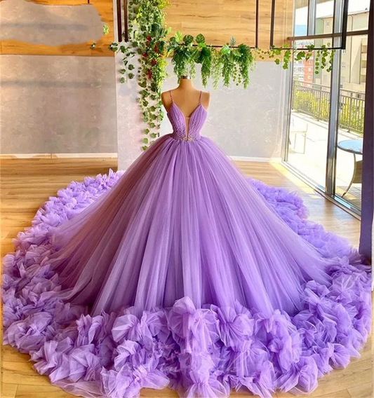 Pretty Irregular Ruffle Spaghetti Straps Light Purple Prom Dresses With Flower Long Birthday Dress SH2897