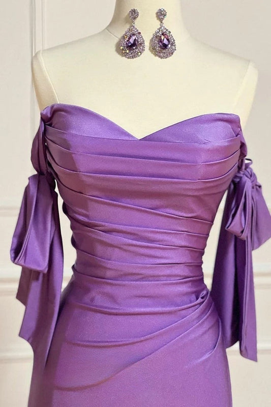 Fashion Purple Sweetheart Satin Pleated Sheath Silt Prom Dresses Elegant Formal Evening Gowns ED02300