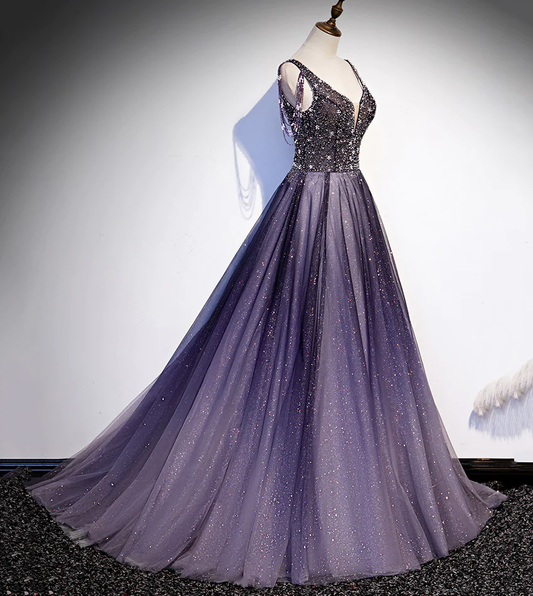Charming Purple Gradient Tulle V-Neckline Long Party Dress, A-Line Prom Dress gh244