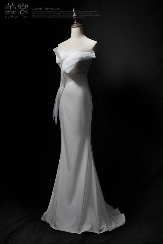 White Mermaid strapless satin tulle long prom dress, white formal long dress ED01151