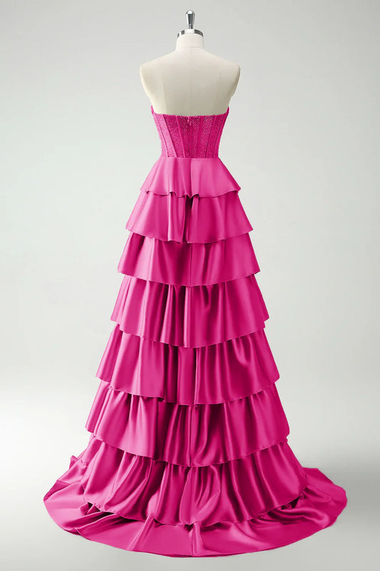 Fuchsia A-line strapless sweetheart neck satin simple long prom dress ED01398