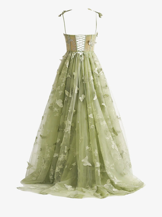 Green A-line Butterfly Lace Corset Prom Dress with Slit ED01376