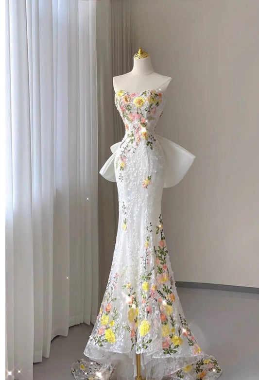 White Wedding Dress Elegant Mermaid Strapless Tulle Lace Long Prom Dress Applique Evening Dress ED01443