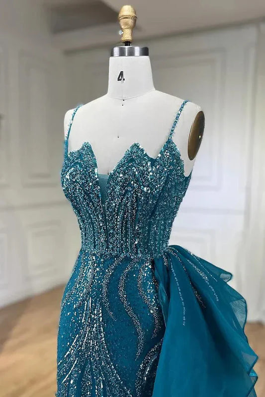 Sky Blue Elegant Mermaid Spaghetti Strap Tulle Beading Long Prom Dress ED01448