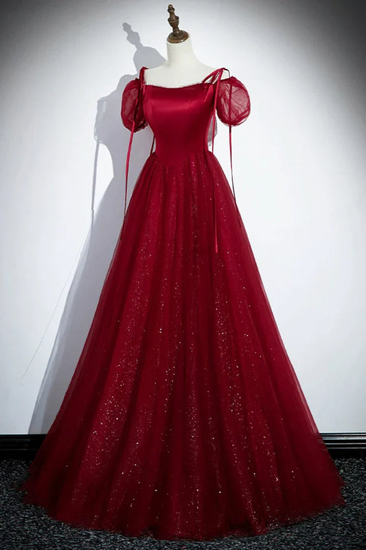 Burgundy A-Line Satin Tulle Floor Length Prom Dress, Off Shoulder Formal Evening Dress ED01455