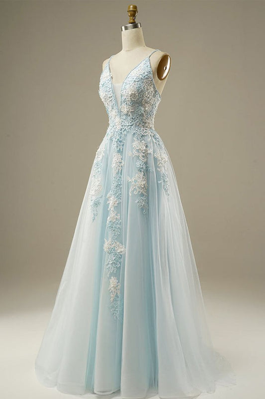 Light Blue A-Line Spaghetti Strap Tulle Beading Long Prom Dress Sweet Embroidery Applique Evening Dress for Graduation ED01617