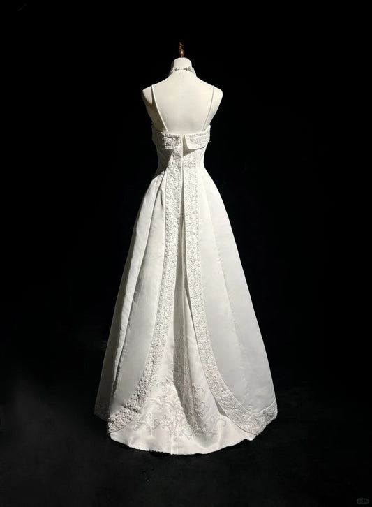 A-Line Spaghetti Strap Beaded Satin Long Prom Dress White Wedding Dress Graduation Prom Dress ED01630