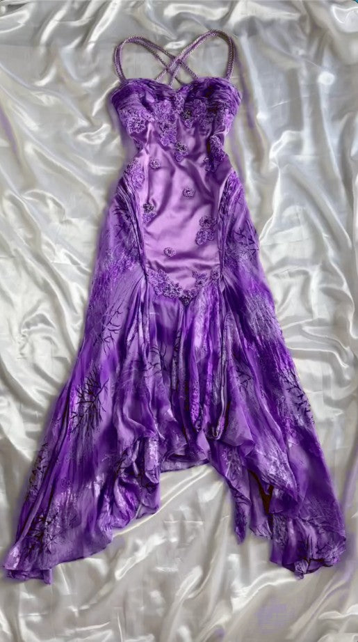 Gold Vintage Floral Satin Applique Spaghetti Straps Chiffon Prom Dresses Party Dresses ED01676