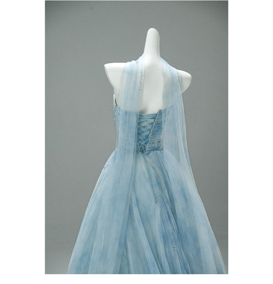 Gorgeous Strapless Blue A-Line Tulle Evening Dress Sparkling Beaded Long Prom Dresses ED02059