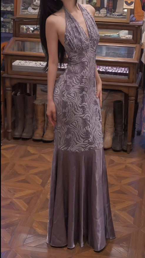 Gray Purple V-neck Mermaid Jacquard Satin Fashion Dresses Elegant Backless Prom Dresses ED02215