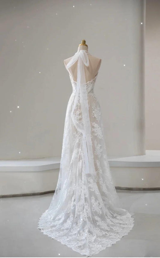 Elegant White Lace Applique Beaded A-line Vintage Wedding Dress ED02216