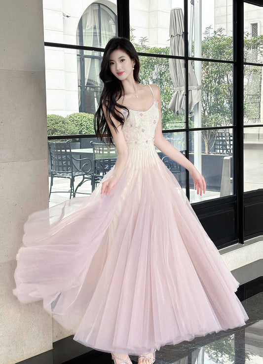 Fairytale Pink Spaghetti Straps Long Birthday Dress Chiffon Ruffles Layered Fashion Party Dresses ED02230
