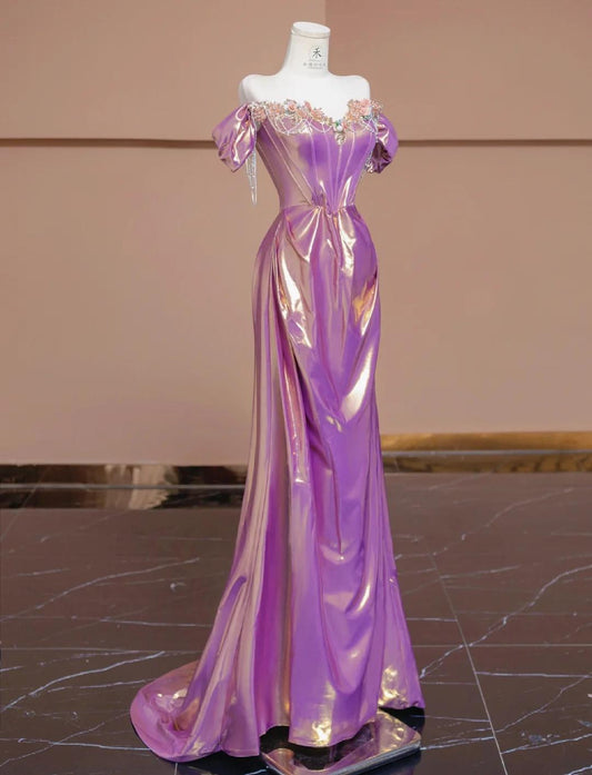 Gorgeous Purple Off Shoulder Satin Beaded A-line Long Prom Dresses Stylish Formal Evening Gowns ED02356