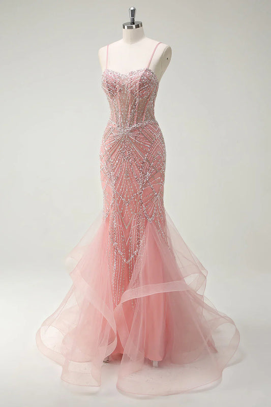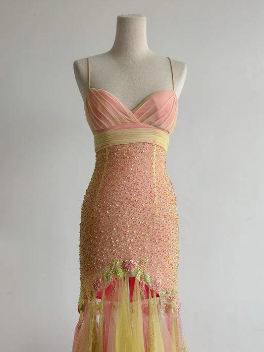 Gorgeous Pink Yellow Tulle Mermaid Spaghetti Straps Beaded Long Prom Dresses Vintage Formal Evening Gowns ED02371
