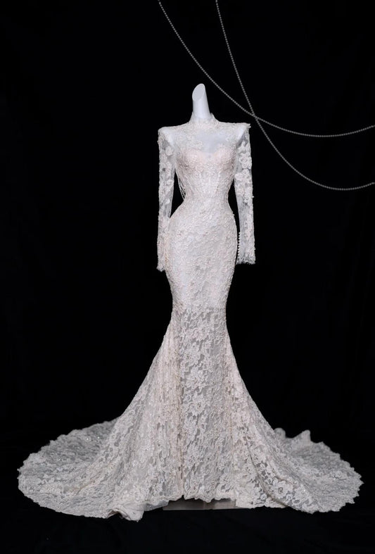 Elegant White Turtleneck Lace Beaded Mermaid Long Sleeve Trailing Wedding Dress ED02479