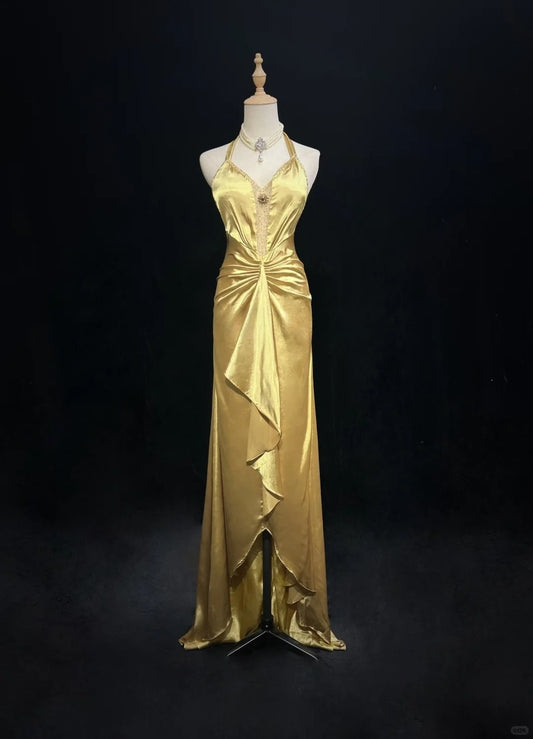Elegant Yellow Halter Sheath Satin Long Prom Dresses Vintage Formal Evening Gowns ED02568